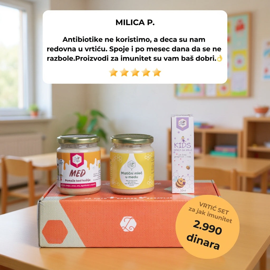 Vrtić (Školarac) set je pažljivo odabran presek najdelotvornijih pčelinjih proizvoda Zlato u tegli brenda za maksimalnu podršku imunitetu i prijatan početak vrtićke ili školske avanture.